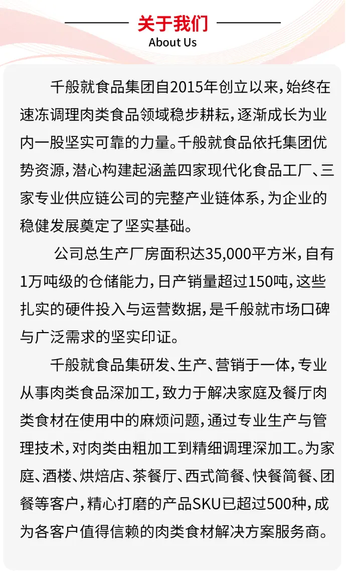 同时为了丰富粤菜调理肉类产品品项,我们成立了广州千般好食品有限公司,增加烧腊系列产品。